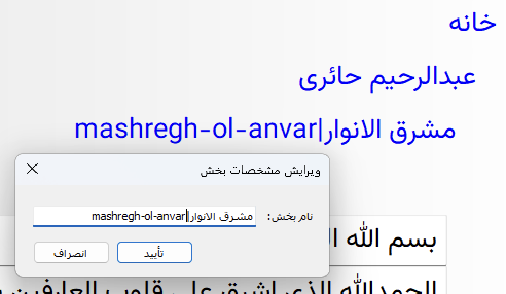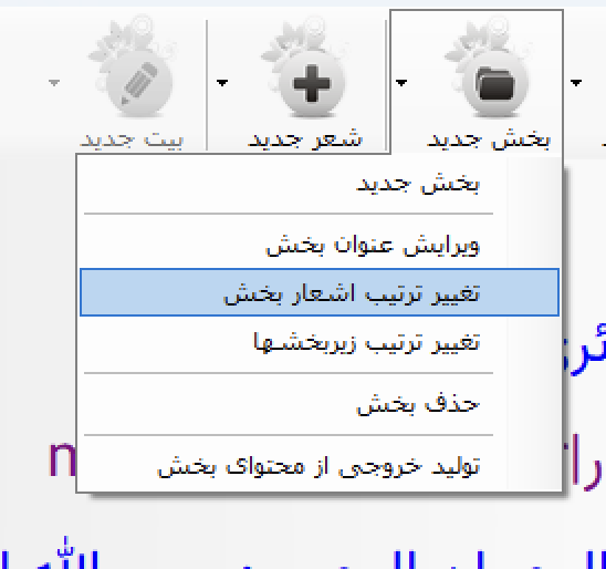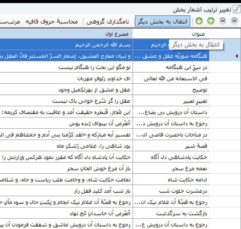 - خیلی وقتها بخشبندی مجموعهٔ ارسالی نامنظم است. از طریق زیرمنوهای «بخش جدید» در ویرایشگر یعنی «تغییر ترتیب اشعار بخش» و «تغییر ترتیب زیربخشها» اشعار و بخشها را منتقل و مرتب میکنم.