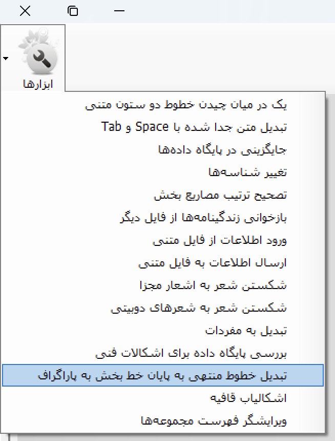 - انتظار میرود بلوکهای پاراگراف متنی برای متون منثور شامل enter نباشند. از منوی «ابزارها» برای رفع این ایراد استفاده میکنم. انتظار میرود که متون منثور حتیالامکان در بخشهای کوتاه در دسترس قرار گیرند. گاهی متون طولانی را با استفاده از ابزارهای ویرایشگر میشکنم. گاهی متون اضافه شده توسط گردآورنده یا مصحح به عنوان بخشی از متن (پاراگراف نثر) در دسترس قرار گرفتهاند. نوع این موارد را به «توضیح» تغییر میدهم (اگر متن حجیم نباشد و من حوصله و وقت داشته باشم).