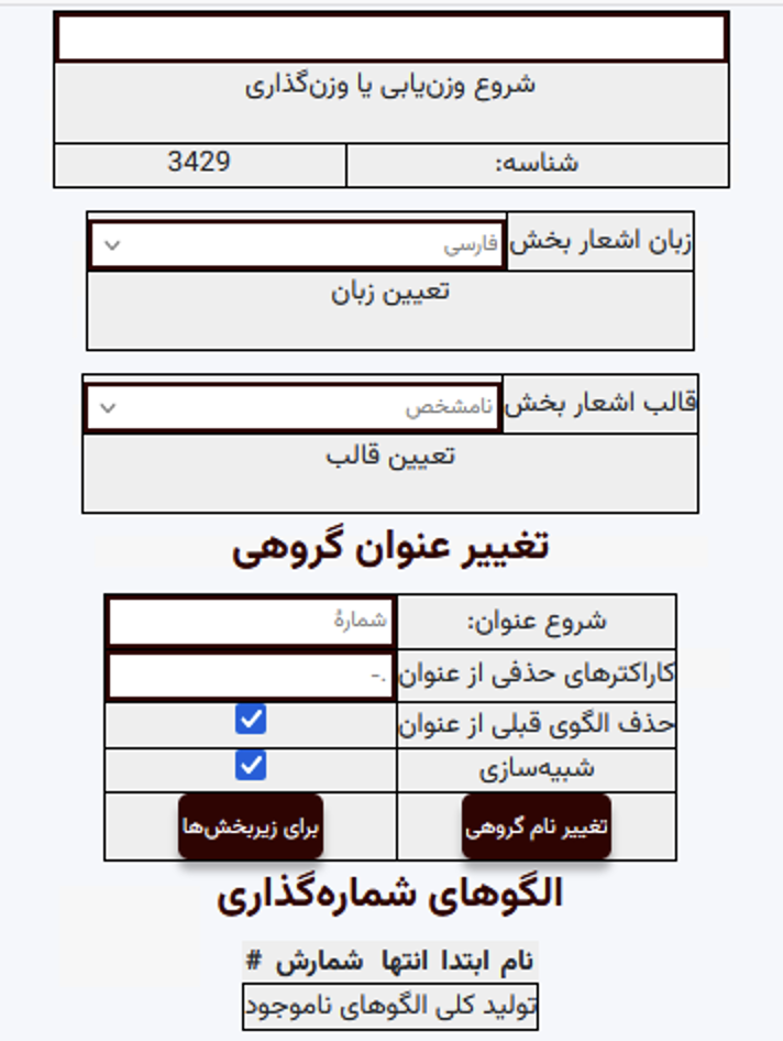وزنیابی (اگر کل یک منظومه بر یک وزن نباشد) با استفاده از سرود انجام میشود. بعضی از فرایندهای دیگر مثل شمارش واژگان و ساخت آمارها و مانند آن برای هر بخش جداگانه و به صورت دستی شروع میشود. نام ارسالکننده را در منبع دیجیتال میگنجانم.