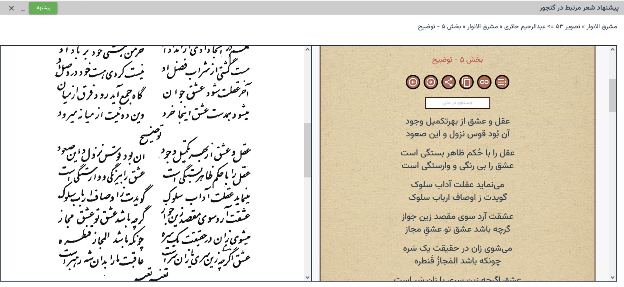 ۵. اگر بتوانم منبع چاپی مجموعه را پیدا کنم، اگر در نسکبان نباشد آن را بارگذاری و OCR میکنم. اگر تعداد صفحات آن کم باشد متن را به شکل دستی با نسکبان همگام میکنم اگر نه سعی میکنم با همگامساز خودکار نسکبان آن را همگام کنم که در اغلب موارد خروجی نهایی مطلوب نیست.